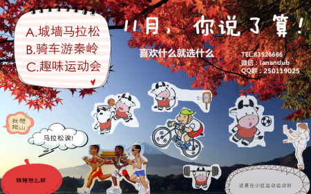 11月,您想参加什么活动呢?莱安会为大家精选了三个活动,根据投票人数最多的一项开展活动:1.城墙马拉松,2.骑车游秦岭,3.趣味运动会。您更喜欢哪项活动呢?或者您有更好的建议吗?莱安会开通了微信、QQ、微博及电话互动方式,请将您的意见在下周一前告诉我们。--本月活动,你说了算! 电话:83526666 微信:lananclub 微博@莱安会 QQ群:250119025