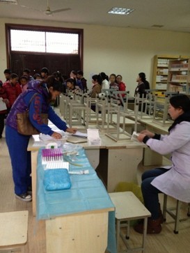 到达儿童村,工作人员布置好场地,孩子们排成一列,领取体检表开始体检。
