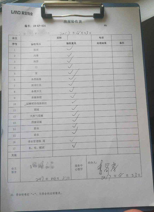 截止4月24日,莱安城一期三天累计交房68户。为业主顺利收房,项目部、营销部、物业、施工单位全程服务,在业主们严格的实测实量验收下,均一次性验收通过。