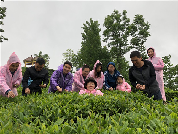 记得我们到达江榜茶园的时候,天公不作美,下起雨来了。不过,这哪里会阻挡的住我们前进的脚步呢?反之,下着雨的茶园,另有一番风味,大家穿着雨衣采茶,谈天说地,笑语连连。