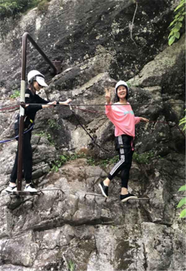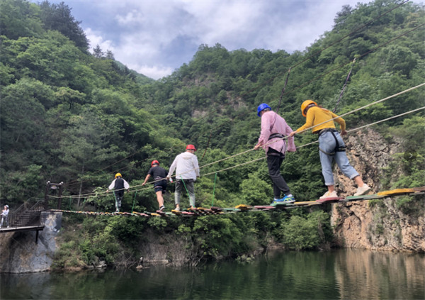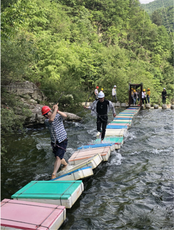 一个团队中必然有性格截然不同的人,胆大的如履平地照样可以对着镜头摆着pose,胆小的紧张的紧盯绳索不敢迈出一步,在伙伴们的鼓励和助威下,胆小的也勇敢地走上了绳索,完成了此项既冒险又刺激的游戏项目。