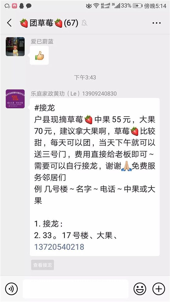 今年春节疫情最严峻的时刻,黄玏联系到了卖草莓、凉皮、馒头、蔬菜等商家,在业主群主动发起团购接龙,帮大家解决生活所需。这些物资都送到了莱安逸珲门口,她主动义务为大家接货分货,而她自己没有任何报酬。我也深受其惠,买到了物美价廉的水果馒头和擀面皮。