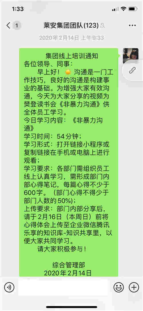 假期漫长,为了让大家不与社会脱节,集团综合管理部每周举办两次培训学习,并为大家精心推荐了书籍,让假日里的生活过的充实而有意义。 大家深刻意识到专业的知识才能为客户提供保障,我所在的成本采购部门也进行了多次视频会议及线上培训。