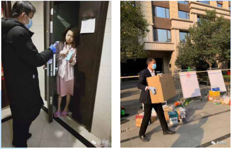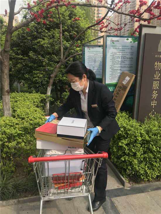 在楼管员张娜接受隔离观察、15号楼整个封闭后 ,她和客服部的其他员工除了自己的日常工作,立即和大家投入到为15号楼业主运送生活物资和接收快递中,每天分派物件输送物资到每户门口成为每天的惯例。