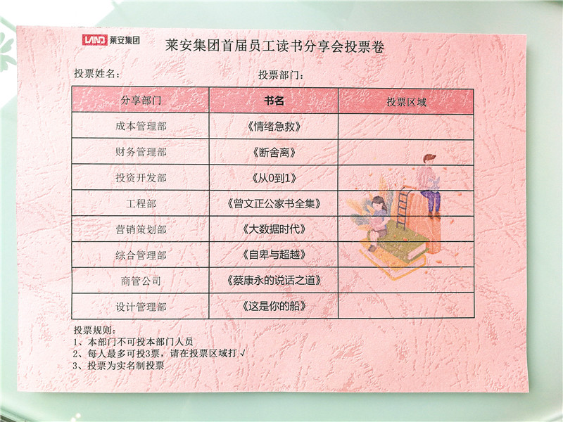 为了公平评选出本次读书分享会 优胜奖的获得者, 我们精心设置了投票环节, 每个部门出一位员工担任评委投票。