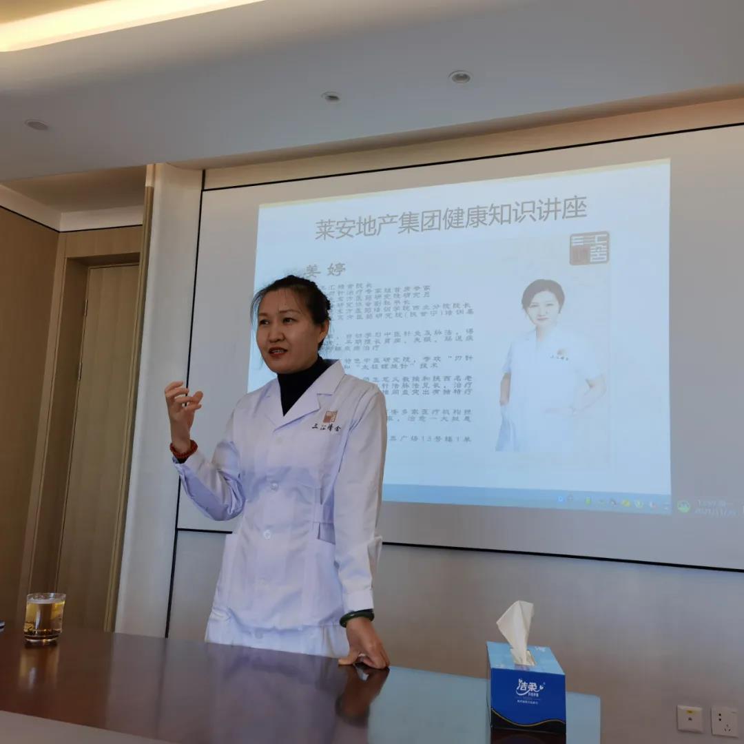 本次讲座邀请了陕西三汇精舍 诊疗中心姜婷院长为大家授课。 姜院长结合中医针灸, 就肩、颈、腰等常见职业病的 预防和的治疗展开讲解, 大家通过听讲获取到了不少健康知识。