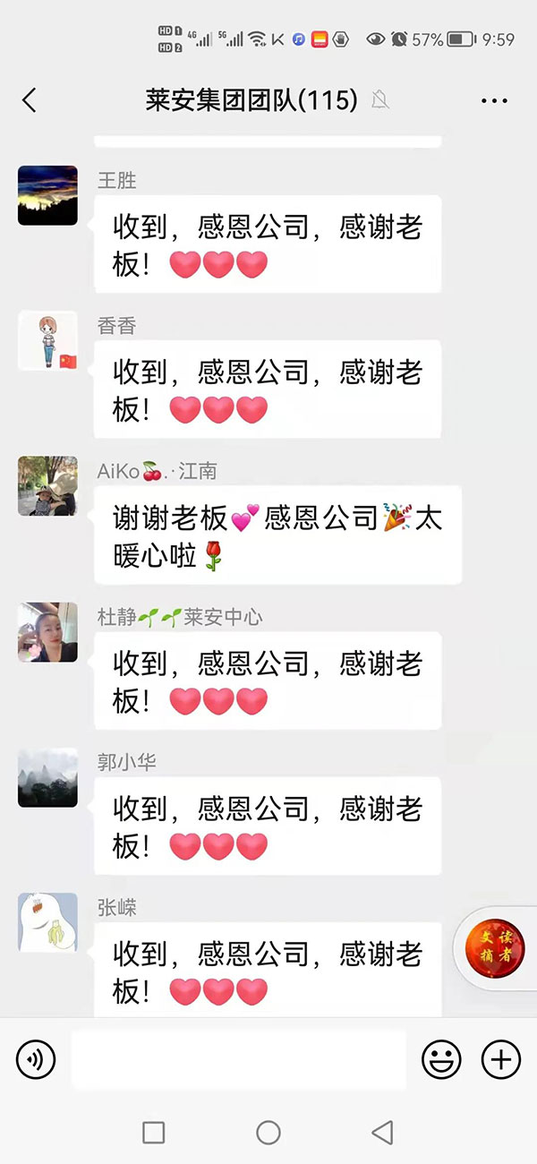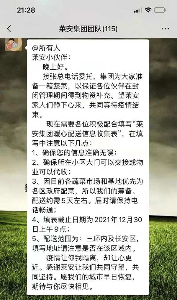 病毒无情,莱安有暖, 西安封城后物资紧缺时, 莱安集团及时向员工们 送去了一份温暖和关怀。
